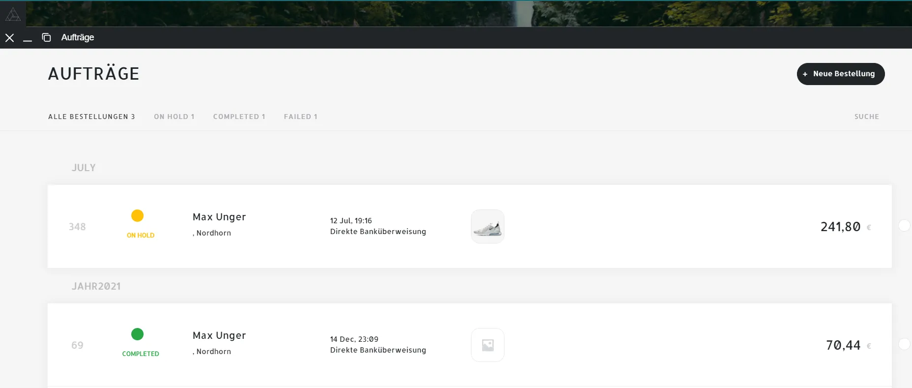 "Aufträge". Klicken Sie auf "Neue Bestellung" oben auf der Seite, um eine neue Bestellung manuell anzulegen.